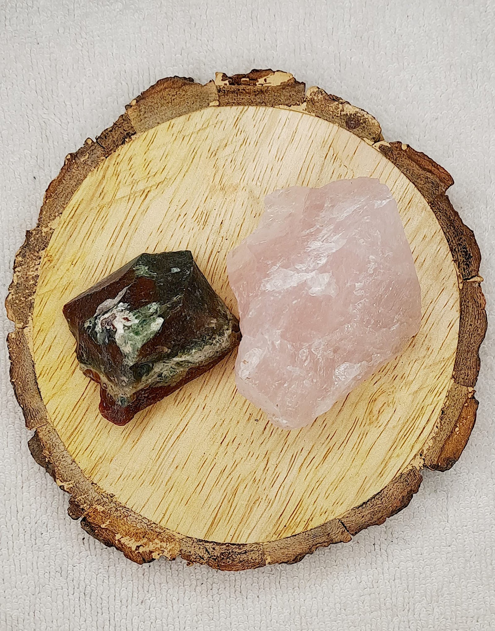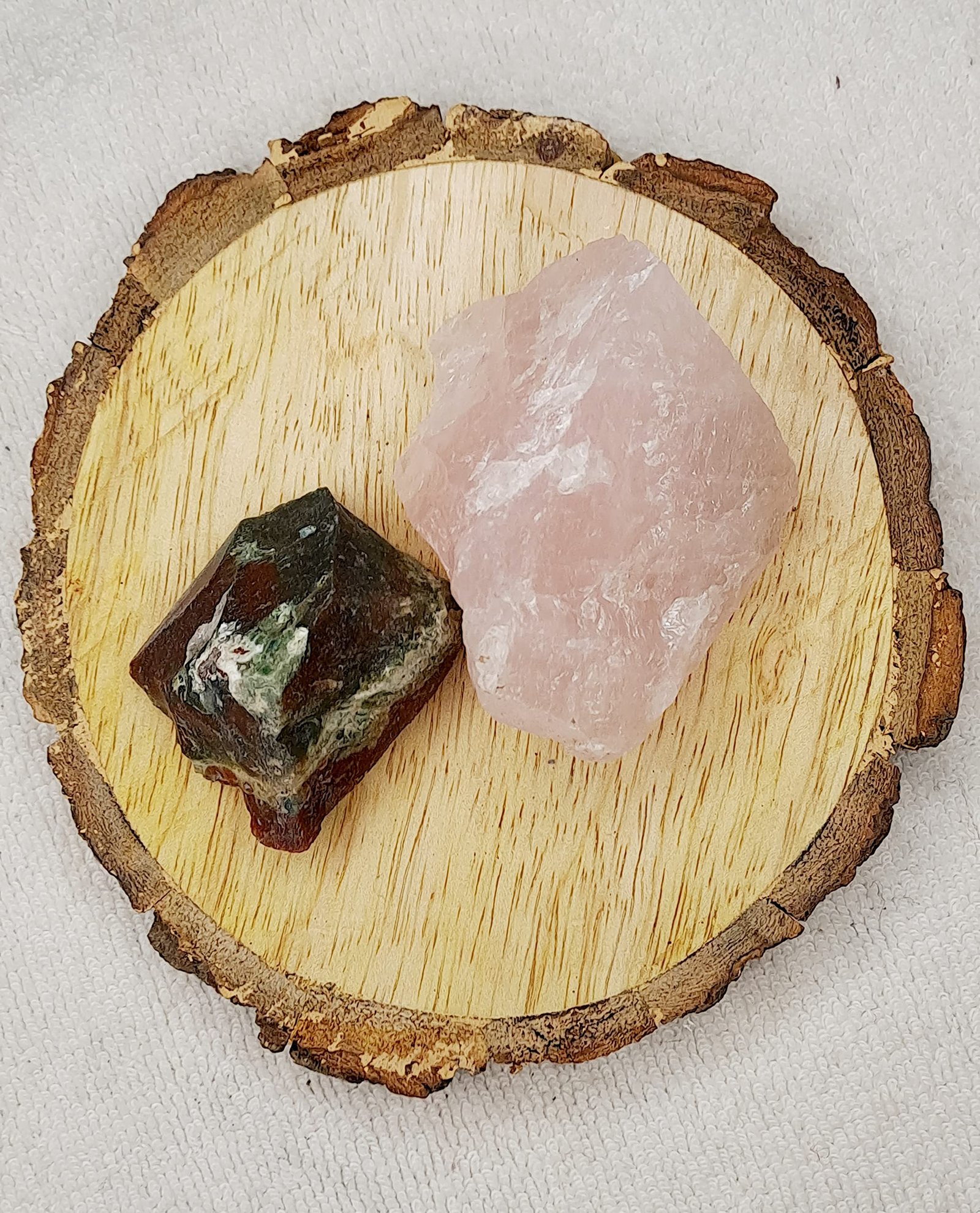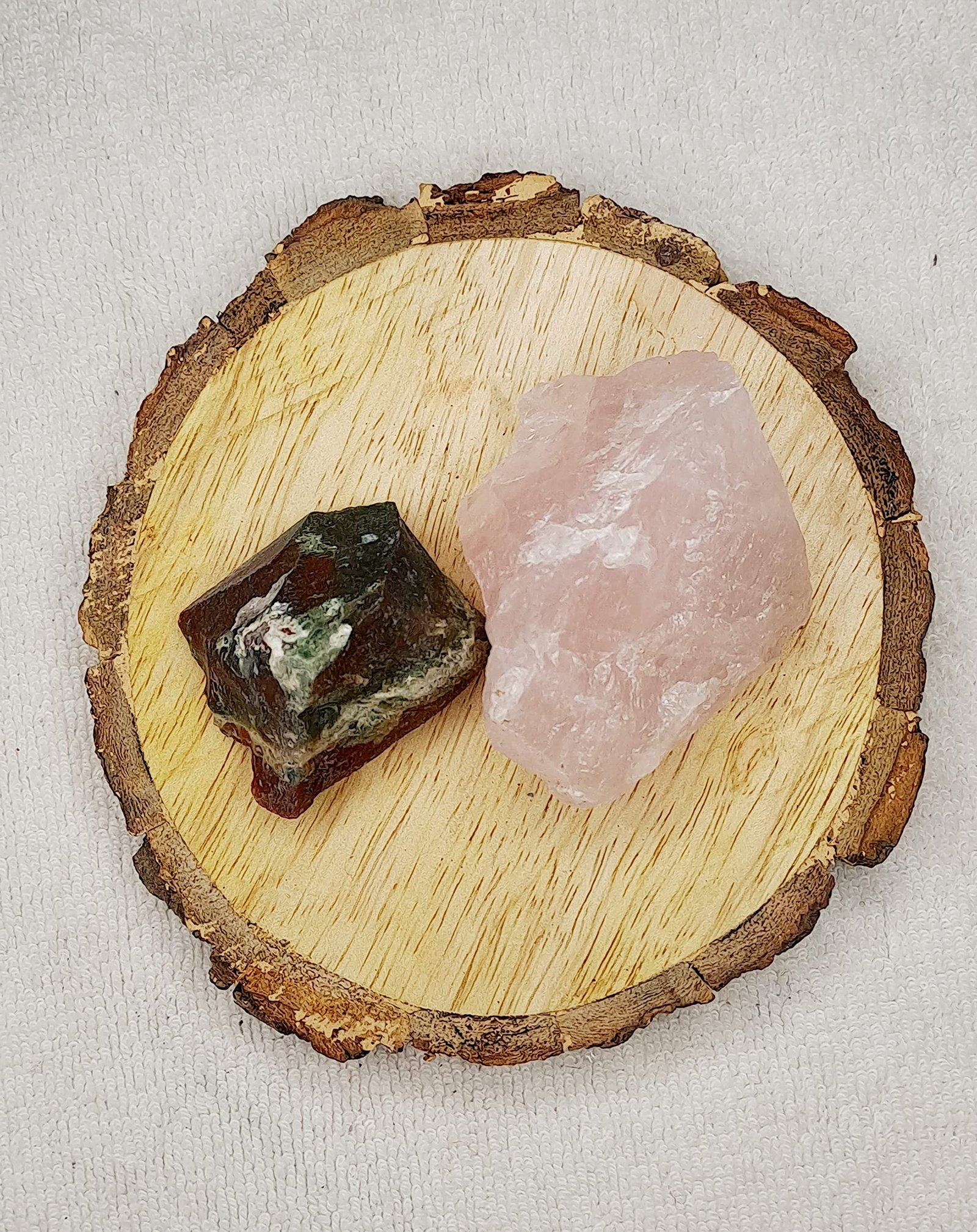 Blood Stone and Rose Quartz AAA Grade Raw Natural Crystal Combo with Wooden Natural Bark Coaster for Healing, Meditation and Manifestation