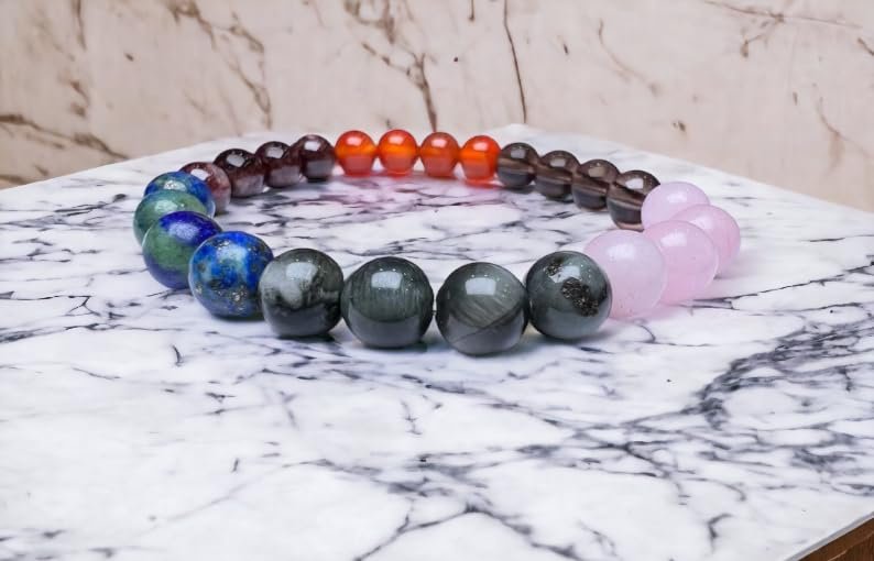 Crystals used in the Bracelet: Carnelian – It is known as the stone of motivation, supporting Capricorn’s determination and passion, Smoky Quartz – It gives earthy Capricorns the grounding energy they need to thrive., Rose Quartz- It brings love and reduces the stress that comes along with the Capricorn’s need to change the world., Grey Cats Eye- It relieves the stress and releases positivness through the love of all kinds., Azurite Malachite – It is the best stone for Capricorn’s for balancing work ethics with Spirituality. Garnet – The most important lucky stone for Capricorn natives is Garnet also known as Raktamani in Hindi