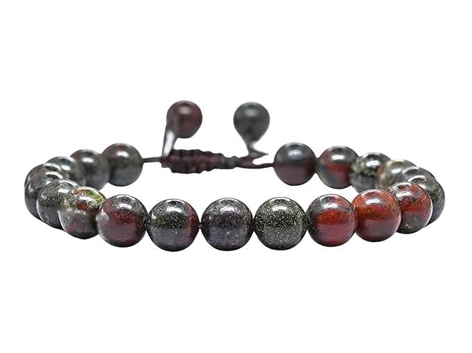 Dragon Blood Stone is considered a stone of transformation and spiritual growth. It is believed to assist individuals in connecting with their inner wisdom, deepening meditation practices, and gaining insights into their spiritual path., Unisex – Good Matching for Men and Women, Boys and Girls., Round bead size is 8mm, inner Length of bracelet is 7 inches and as it is Adjustable so it can extend upto 10 inches as well as convenient to put on or take off., These Crystal bead bracelets are made with hand selected 8mm round high quality beads, safe and durable, do not irritate the skin.