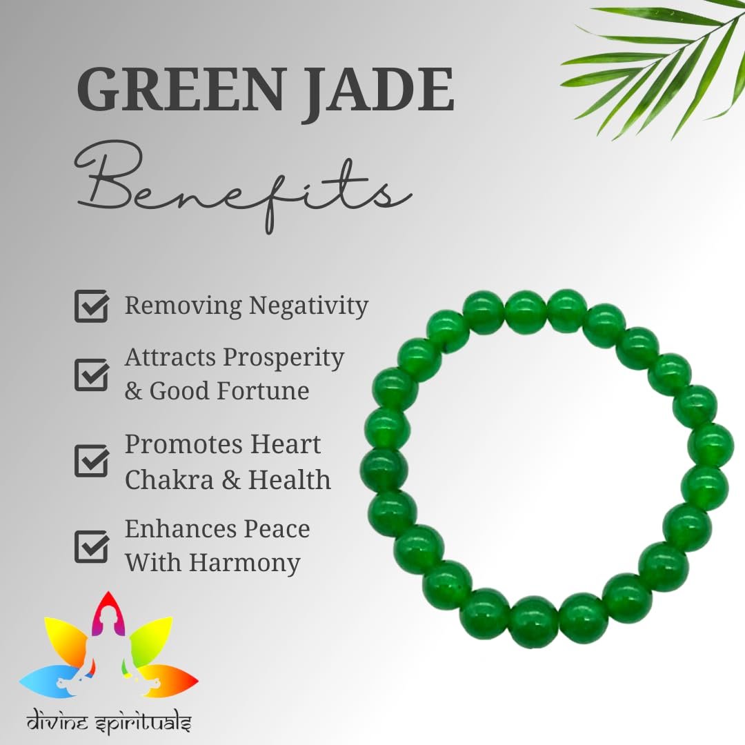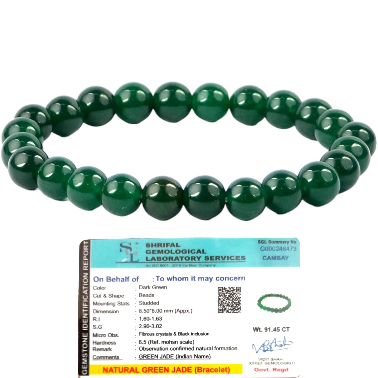 This AAA grade lab-certified 8mm Green Jade bracelet epitomizes excellence with its exceptional quality and unique properties. Meticulously crafted, the jade beads exhibit a rich, vibrant green hue, signifying purity and serenity. The bracelet showcases flawless craftsmanship, ensuring durability and timeless beauty. With a smooth, polished surface, each bead reflects light elegantly, enhancing the bracelet’s overall allure., Green Jade is renowned for its ability to bring harmony and balance to the mind, body, and spirit. It promotes a sense of peace and tranquility, making it an excellent stone for meditation and stress relief. It brings equilibrium in various aspects of life, fostering a state of well-being and calmness. Its energy is thought to encourage harmony not only within oneself but also in relationships and the surrounding environment., Green Jade is a symbol of good luck, prosperity, and abundance. It is believed to attract positive energy and opportunities for financial success. Green Jade’s energy is associated with the heart chakra, and it is said to help individuals make wise financial decisions by promoting a balanced and insightful approach., In the realm of holistic well-being, this green jade bracelet emerges as a cherished ally, celebrated for its remarkable healing properties. With its calming and balancing energies, this exquisite gemstone bestows anyone with a sense of harmony, promoting both physical and emotional equilibrium, and serving as a timeless source of positive energy., This extraordinary gift is an ideal choice for occasions like birthdays, Valentine’s Day, or any special event where a touch of grace and positive energy is desired. Meticulously crafted to bring joy to your loved ones. Beyond its impressive durability, it also provides unparalleled comfort for everyday wear. With its perfect blend of style and versatility, suitable for both casual and formal occasions.