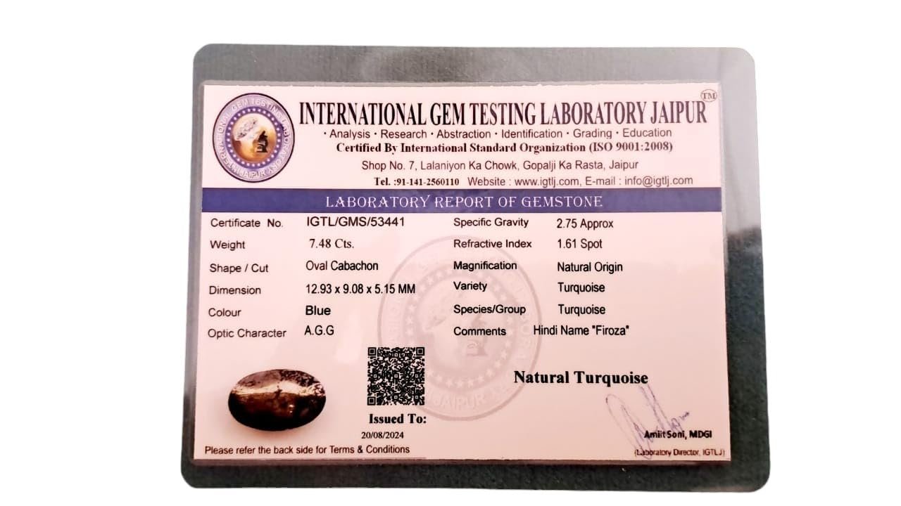 Natural Firoza Turquoise Beautiful Pure Lab Certified Irani Firoza Exclusive Double Polished Gemstones for Peace, Protection Name and Fame for Men and Women (7 to 8 Carat)