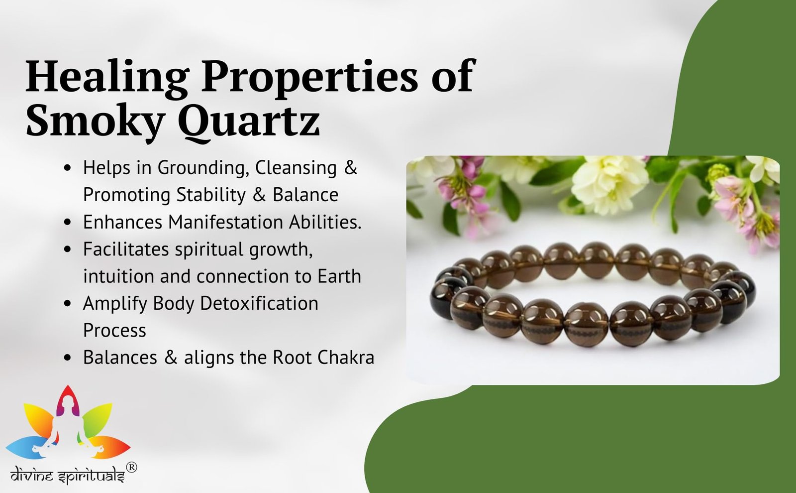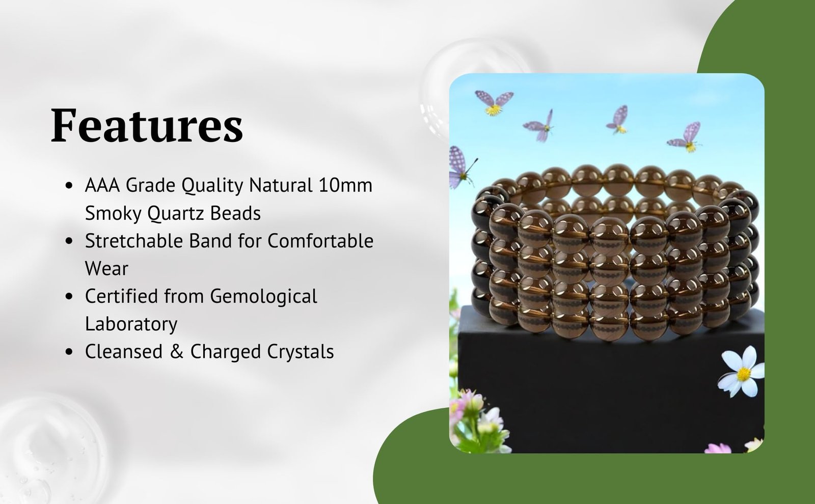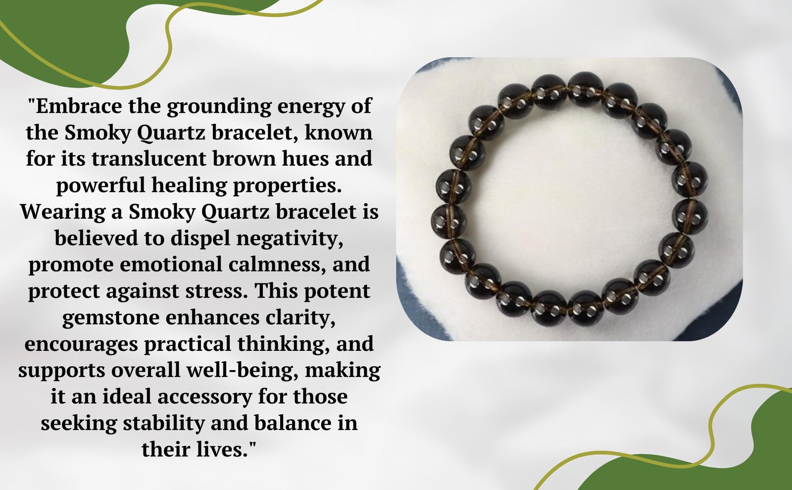 This AAA grade natural Smoky Quartz Bracelet is made from natural 8mm beads comprising the beauty of the evening sky. Its gentle, earthy colors give off a calming vibe, making you feel balanced and beautiful. It carries a soothing energy that helps clear the mind and promotes a sense of positivity., Smoky Quartz is celebrated for its grounding properties, serving as an anchor to the Earth’s energies. It absorbs and transmute negative energies, providing a protective shield against unwanted influences. It has a purifying effect on both the physical and energetic levels. Its energy is believed to help detoxify the body and clear away negative thought patterns, Smoky Quartz is closely associated with the root chakra, serving to ground and balance this foundational energy center. By stimulating the root chakra, Smoky Quartz promotes a sense of security, stability, and connection to the Earth. This grounding effect can help individuals feel more anchored in the present moment and better equipped to navigate life’s challenges with resilience and strength., Adorn yourself with the Smoky Quartz bracelet to embark on a journey of grounding and cleansing, allowing the crystal’s comforting presence to guide you towards clarity, resilience, and a renewed connection with the grounding forces of nature which absorbs and transmutes negative energies, offering a shield of protection and promoting a sense of stability., This elegant gift is an excellent choice for birthdays, Valentine’s Day, or any special occasion that demands a touch of sophistication and positive vibes. Crafted to lift the spirits of your loved ones, its divine aesthetic and enduring allure turn it into a truly meaningful token. With impressive durability, it guarantees unparalleled comfort for day-to-day wear. Its versatility makes it suitable for casual settings, adding a thoughtful and adaptable expression to your display of affection.
