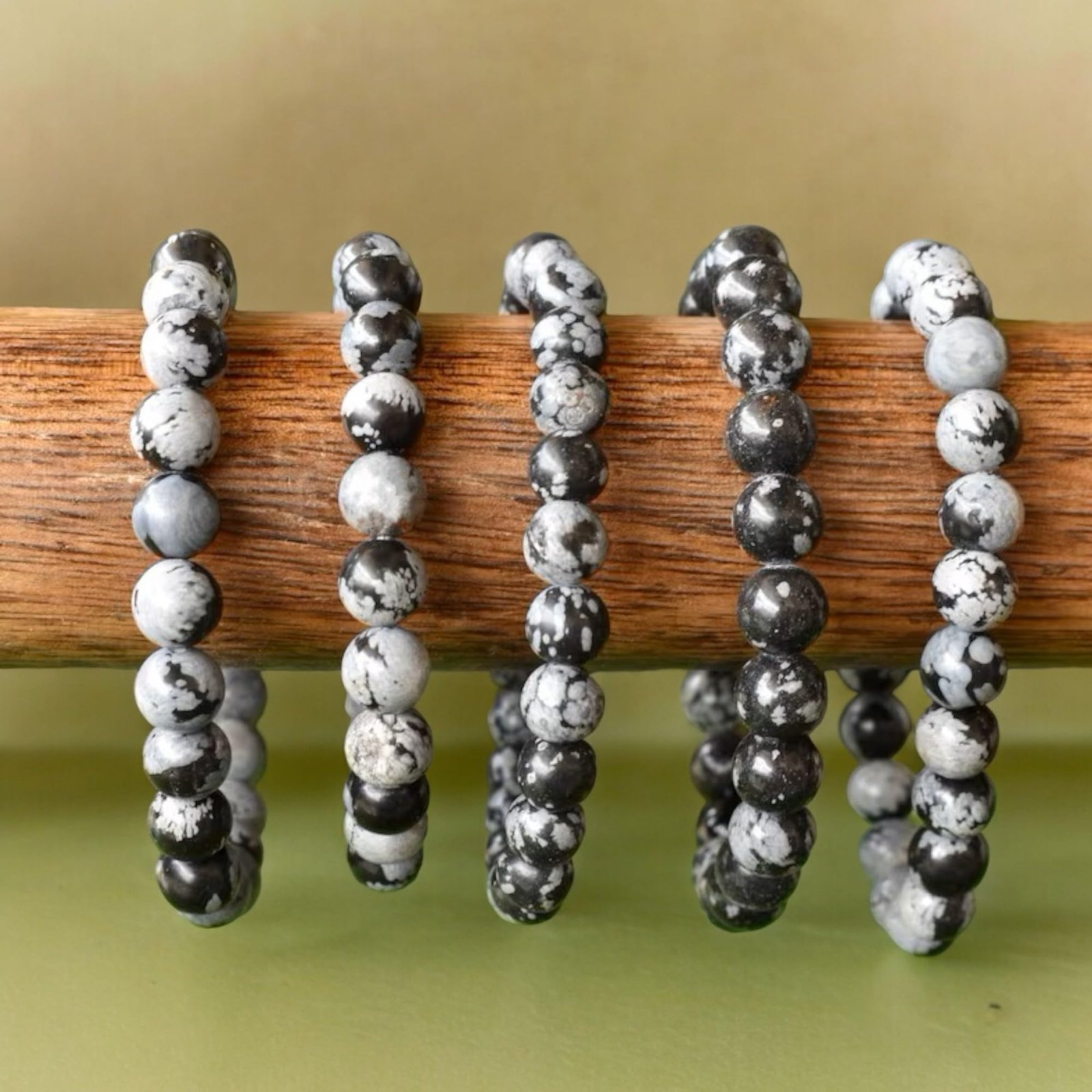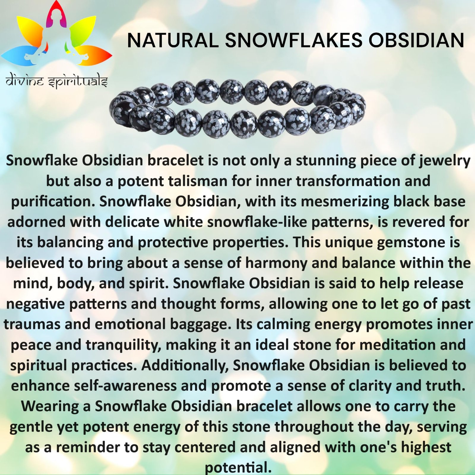 This AAA grade lab-certified Snowflake Obsidian bracelet mesmerizes with its stark black color and unique white snowflake-like patterns. Each meticulously polished bead embodies the stone’s protective energy, offering balance, purification, and inner reflection., Snowflake Obsidian is renowned for its grounding properties, helping individuals stay rooted to the Earth’s energies. Its stabilizing influence promotes a sense of balance, stability, and inner strength, especially during times of change or uncertainty. Snowflake Obsidian encourages individuals to remain present in the moment, fostering mindfulness, clarity, and emotional stability., Snowflake Obsidian is believed to assist in releasing negative patterns, habits, and thought forms that no longer serve one’s highest good. Its purifying energy helps individuals identify and confront self-limiting beliefs, fears, and emotional blockages, facilitating inner transformation and personal growth., Embrace the tranquil energy of Snowflake Obsidian, this enchanting gemstone, with its stark black base and delicate white speckles, offers a sense of balance and purification. Adorn yourself with Snowflake Obsidian to release negativity, promote inner peace, and foster a clearer perspective. Let its calming presence guide you through moments of transformation and peace., An impeccable selection for birthdays, Valentine’s Day, and significant occasions, this gift emanates positivity and refinement, delighting your loved ones. Its enchanting appearance and divine essence make it truly exceptional, destined to be cherished. Its lasting durability ensures enduring admiration, while its adaptability offers comfortable everyday wear and a touch of stylish grace for informal gatherings.