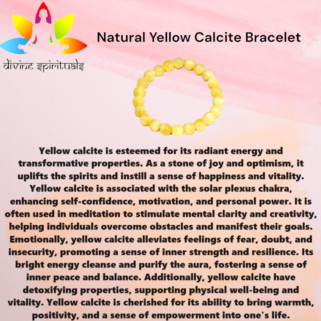This AAA grade lab-certified Yellow Calcite bracelet radiates warmth with its sunny golden hues, reminiscent of a blissful summer day. Each meticulously polished bead glows with a soft luminosity, reflecting the stone’s uplifting energy and infusing the wearer with optimism and joy., Yellow Calcite is associated with uplifting and energizing properties. Its sunny yellow color is believed to bring a burst of positive energy, promoting feelings of joy, vitality, and enthusiasm. Yellow Calcite is often used to amplify one’s personal power and motivation, known for bringing a more vibrant lifestyle., Yellow Calcite enhances mental clarity and concentration. It is often used as a crystal ally for studying, brainstorming, or engaging in tasks that require focus. The crystal’s energy stimulates the intellect, aid in decision-making, and promote a clear and organized thought process. Yellow Calcite is also associated with boosting memory and learning capabilities., Bask in the uplifting glow of the Yellow Calcite bracelet, a radiant gemstone known for its sunny hues and positive energy. Yellow Calcite enhances personal power, motivation, and clarity of thought. Adorn yourself with the Yellow Calcite bracelet to invite a sense of joy and optimism into your life, encouraging a brighter outlook and promoting mental clarity., This exceptional present is an ideal choice for celebrating birthdays, Valentine’s Day, or any special moment that deserves an infusion of elegance and positive energy. Crafted with the intention of uplifting the spirits of your loved ones, its divine aesthetics and enduring charm bestow upon it a truly meaningful essence. Its durability is noteworthy, and it offers unparalleled comfort for daily wear. A thoughtful expression of affection suitable for both casual and formal occasions.