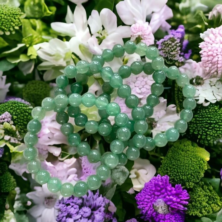 This AAA Grade 8mm Natural Green Aventurine Bracelet is made from natural beads of Green Aventurine highlighting green hue of the crystal and promising authenticity of the bracelet by providing a certificate from reputed gemological lab., The beads of this bracelet are typically smooth, polished, and uniform in size, creating a visually appealing and cohesive look. Bracelet is well-crafted with attention to detail. The beads are securely strung together, and the band used is durable to ensure longevity. This professionally crafted bracelet has a sturdy yet flexible construction, Green Aventurine is a revered healing crystal known for its multifaceted qualities. This crystal brings luck & abundance, attracting prosperity & opportunities into one’s life. Green Aventurine balances heart chakra, fostering harmony & calmness. It is a powerful ally in alleviating stress and anxiety., This crystal is celebrated for its physical healing properties, promoting a healthy circulatory system and enhancing the body’s natural healing abilities by supporting the immune system. As a versatile and well-rounded crystal, Green Aventurine is known for its ability to harmonize mind, body, and spirit, making it a cherished companion on the journey toward holistic well-being., This Green aventurine bracelet is created with the intention of harnessing the internal healing properties associated with the crystal. This includes promoting emotional well-being, attracting prosperity & fostering positive energy. This bracelet is not just a piece of ornament but a true companion in meditation for crystal-lovers.