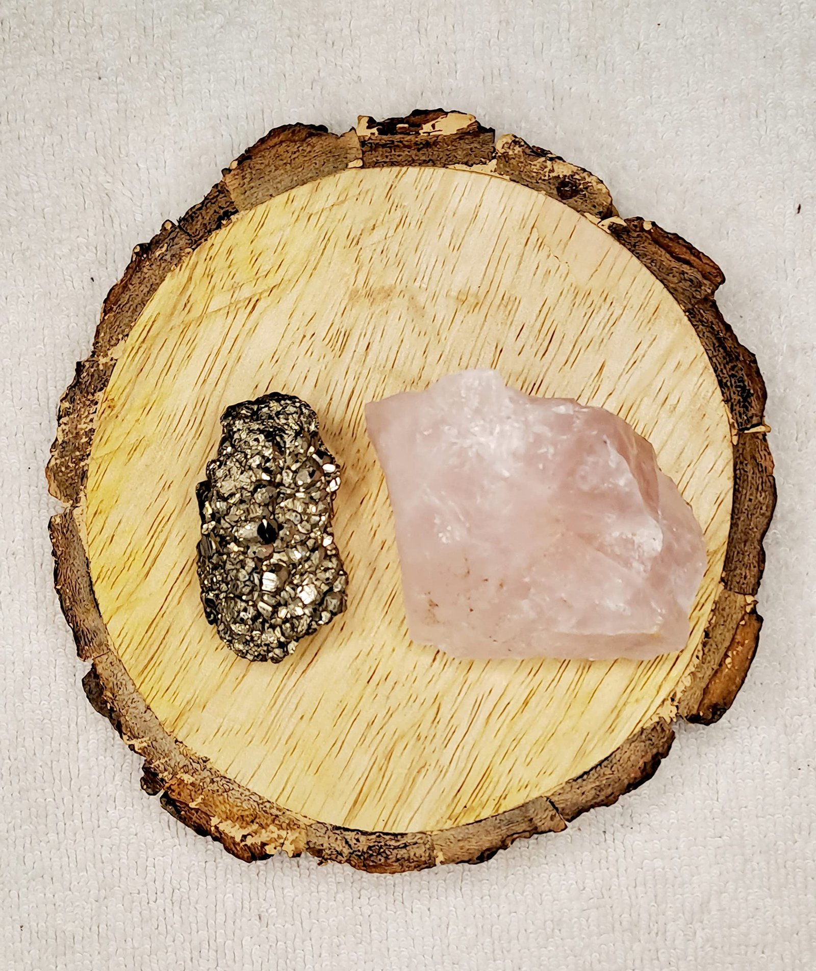 Pyrite and Rose Quartz AAA Grade Raw Natural Crystal Combo with Wooden Natural Bark Coaster for Healing, Meditation and Manifestation