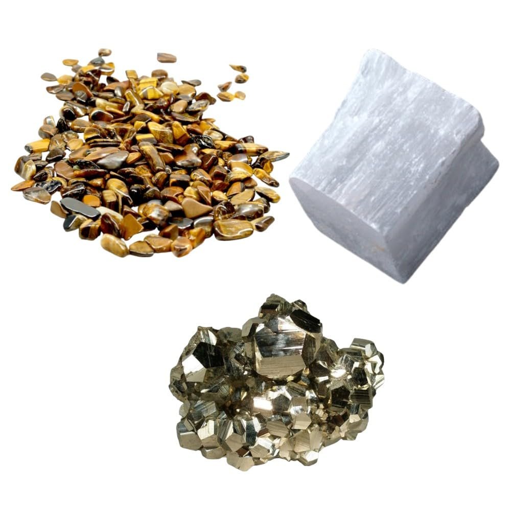 Pyrite Stone Original Certified Natural Raw Geode 40 Grams with 50 Grams Natural Tiger’s Eye Chips and 1 Natural Selenite Stone Raw Block for Healing Meditation and Manifesting Abundance
